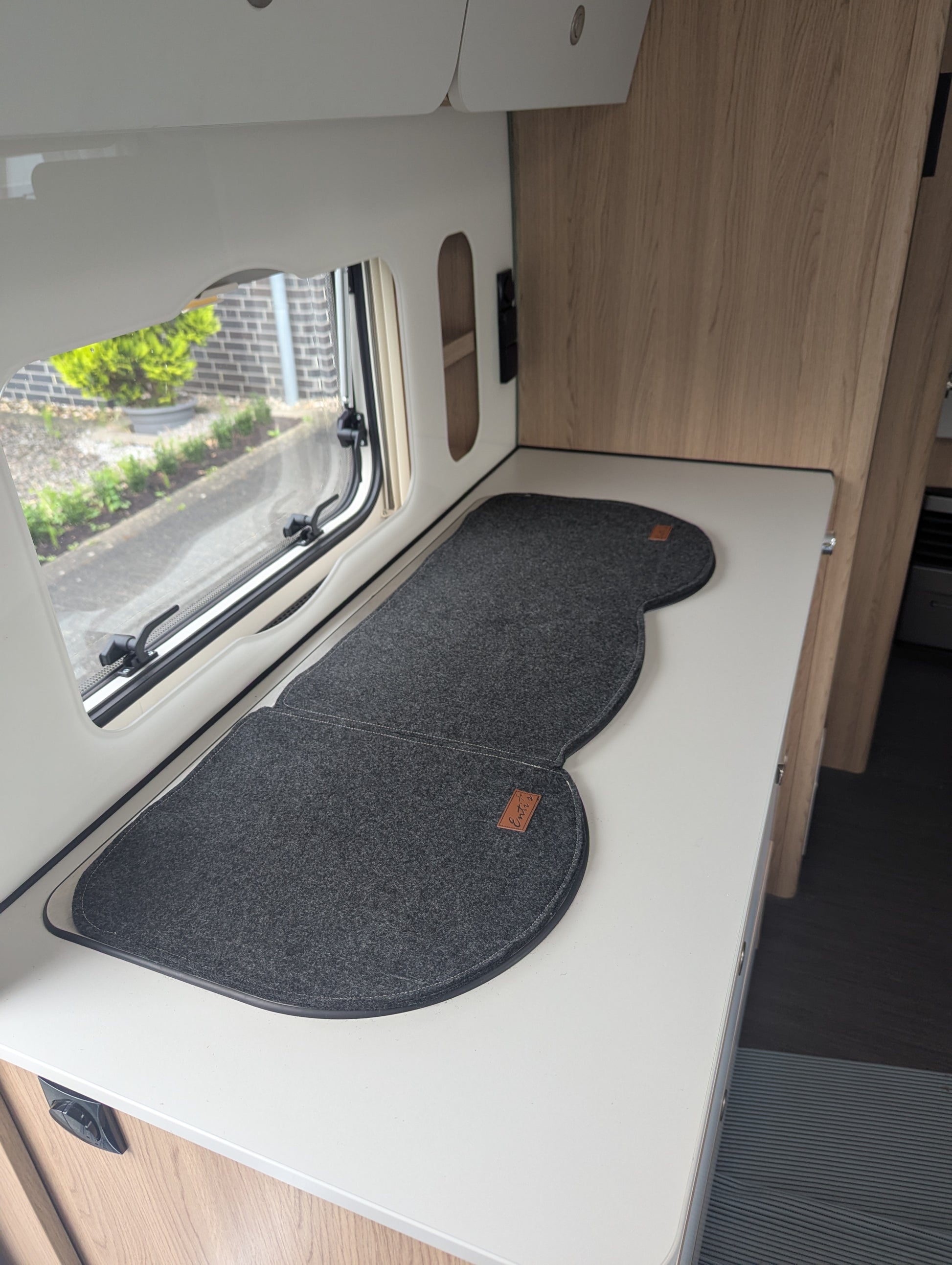 Handgefertigte Filzabdeckung für Herd und Spüle, speziell konzipiert für Dethleffs Aero und LMC 560 ab Baujahr 2023.
